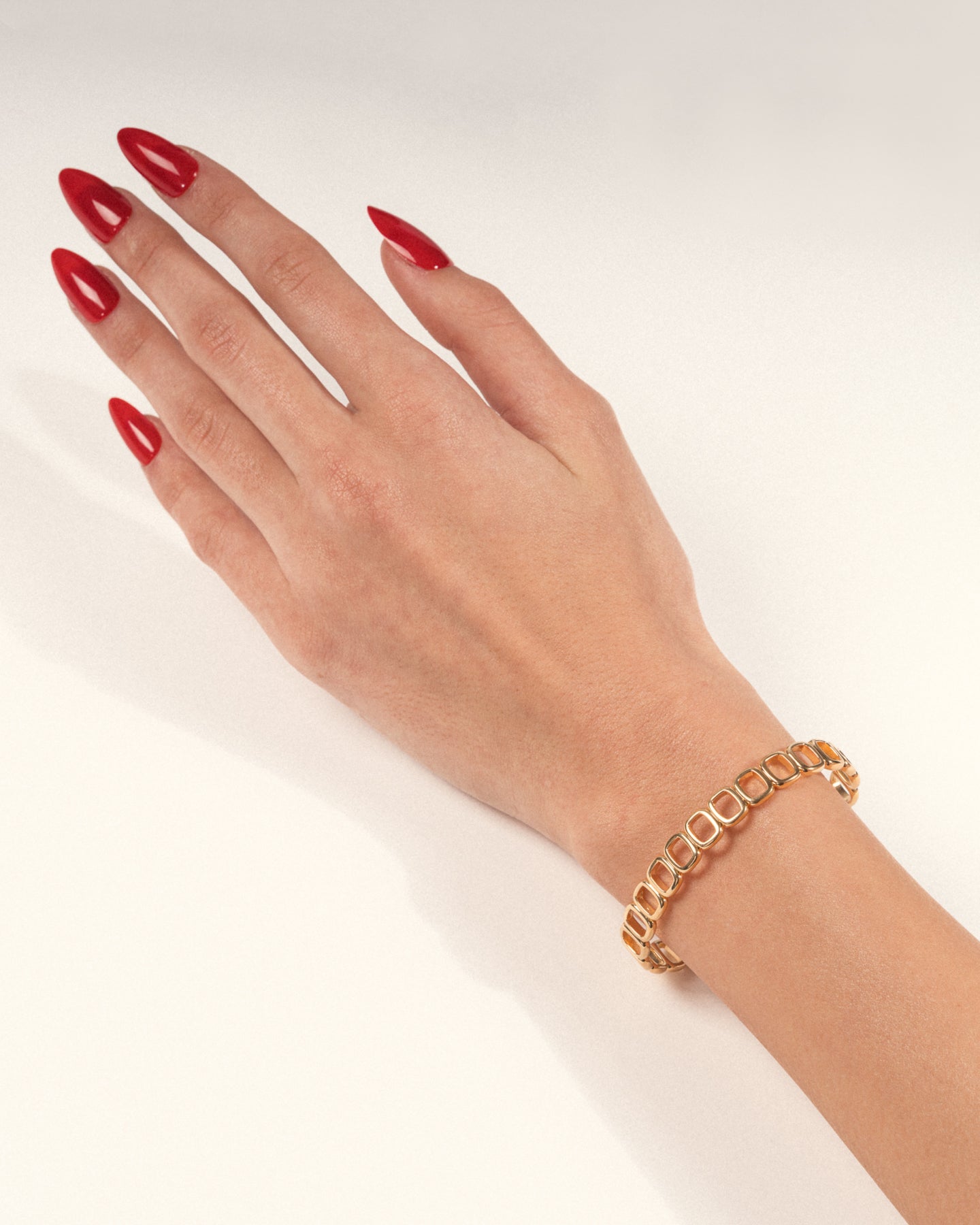 Polished to a high shine, the gold-plated Toy cuff is shaped from minimal, oval links. The angular, cutout silhouette makes it a refined choice for every day.