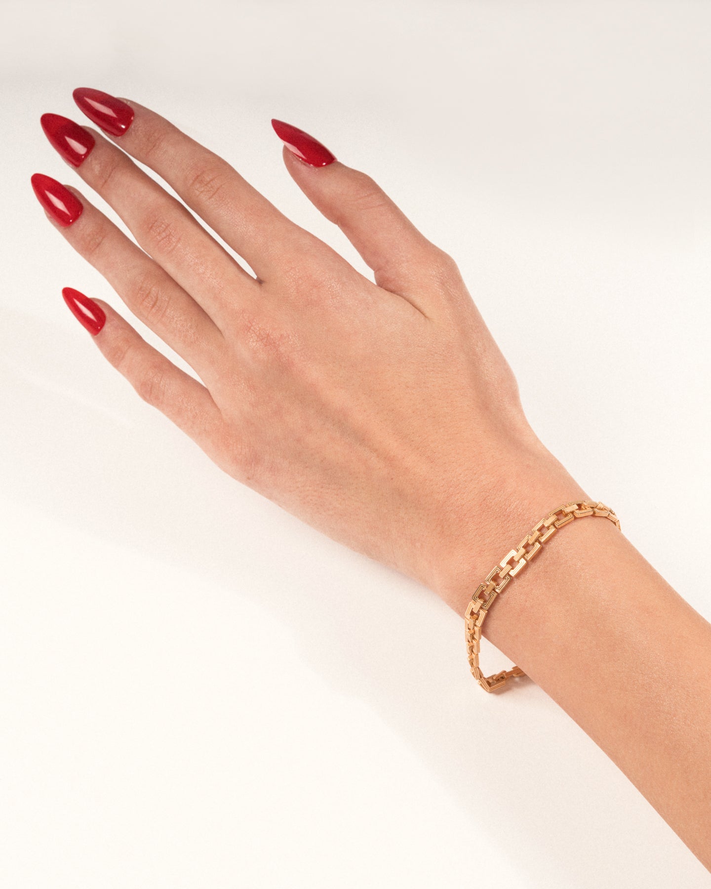 The gold-plated Aurelia Chain bracelet has a delicate profile made up of interlocking square links – each one is expertly crafted for a solid, notably durable feel when worn.